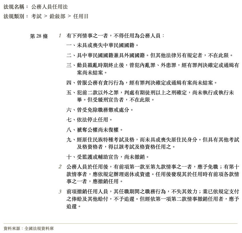 公務人員任用法第28條一項:有下列情事之一者,不得任用為公務人員