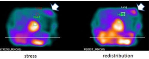 (A)壓力催迫(stress)後,肺部攝取量增加(lung uptake),如附圖所示,可能代表嚴重且冠狀動脈多條血管阻塞