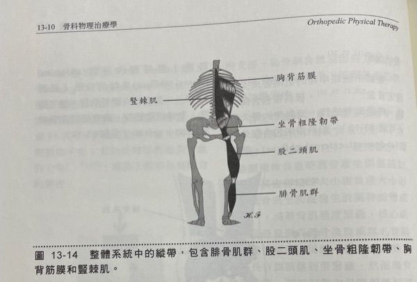 (C)深縱系統(deep longitudinal system) 腓骨肌群、股二頭肌、薦粗隆韌帶、胸背筋膜和豎脊肌