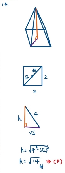 14. 有一個正四角錐,其底面邊長為2,側面腰長為4,求此四角錐的高度。