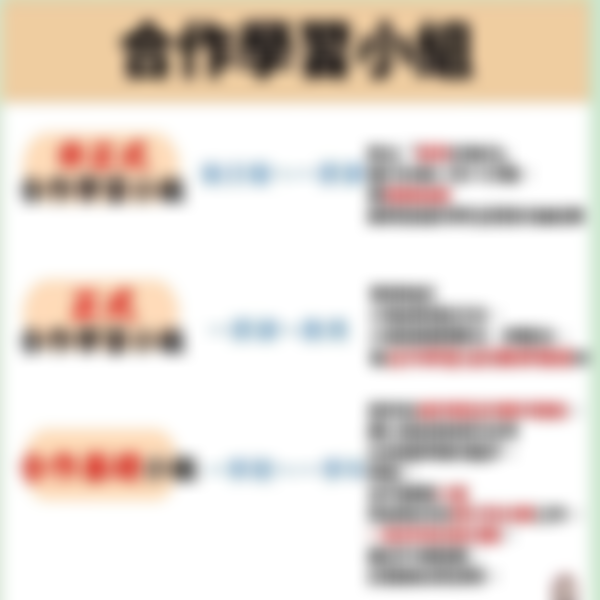 1. 非正式合作學習小組:這種合作學習形式通常只維持幾分鐘到一節課時間,常被用來使學生釐清學習任務、集中注意力焦點、進行更深層次的認知處理,或者教學段落的總結。例如,老師在講解課文內容 10 分鐘之後,提出一個跟課文有關的題目,讓學生以「配對討論法」的方式進行討論 3 至 4 分鐘,然後以隨機抽取的方式請某些組別的某位學生來回答其討論結果。