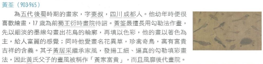 中國五代當時的花鳥畫共分為兩派,一派以黃筌為代表,「鉤勒重彩,濃艷富麗」,「細筆勾勒、填彩暈染」;另一派則以徐熙為代表,「沒骨漬染,輕淡野逸」「下筆成珍,揮毫可范」,風格「清新灑脫」。因此當時被評價為「黃家富貴,徐家野逸」。
