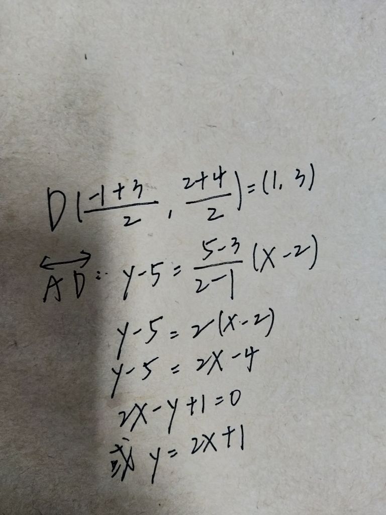 B、C兩點相加除以2求出D點座標,AD方程式用A、D兩點座標帶入兩點式