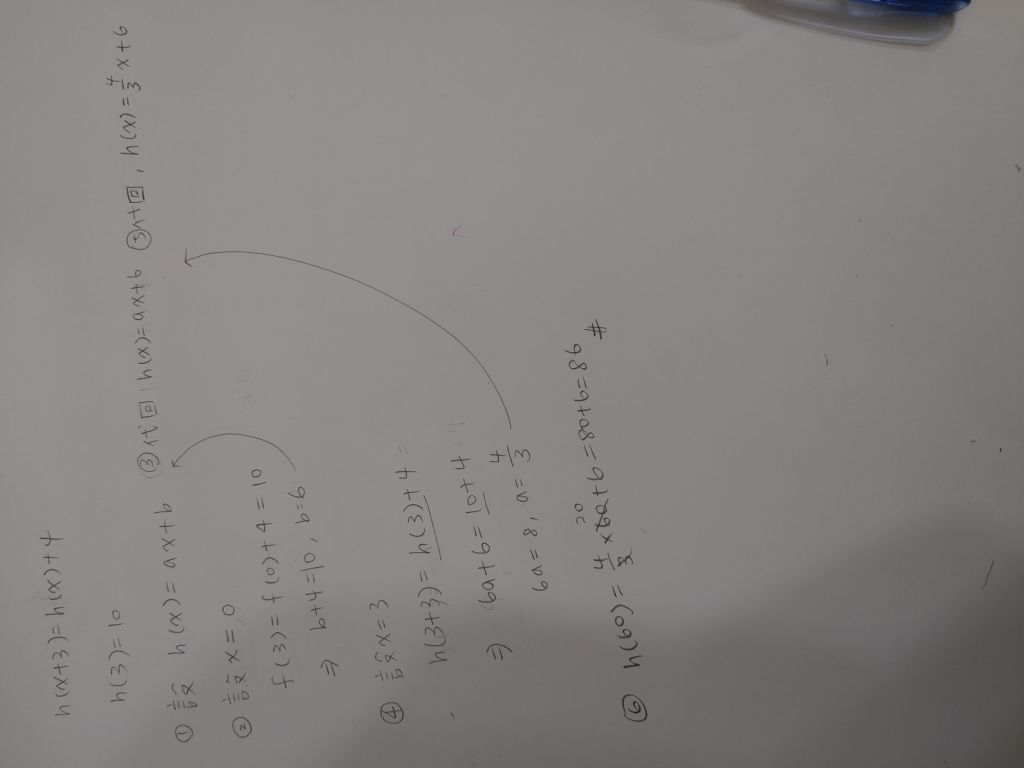 15、令 h 為一滿足 h (x+3) = h (x) +4,且 h (3) = 10的函數,則 h (60)之值為何?