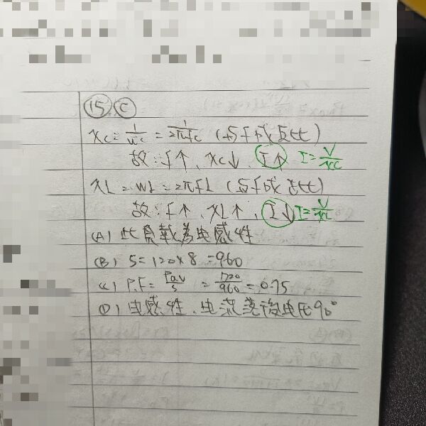 15 一個 720 W 的負載在 120 V/60 Hz 之下量得的電流為 8 A。若提高頻率時,電流會下降。下列何者正確?