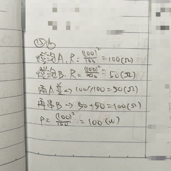 15 燈泡 A 及 B 之額定值分別為 100 V/100 W 及 100 V/200 W,若將兩個燈泡 A 並聯之後、再與一個燈