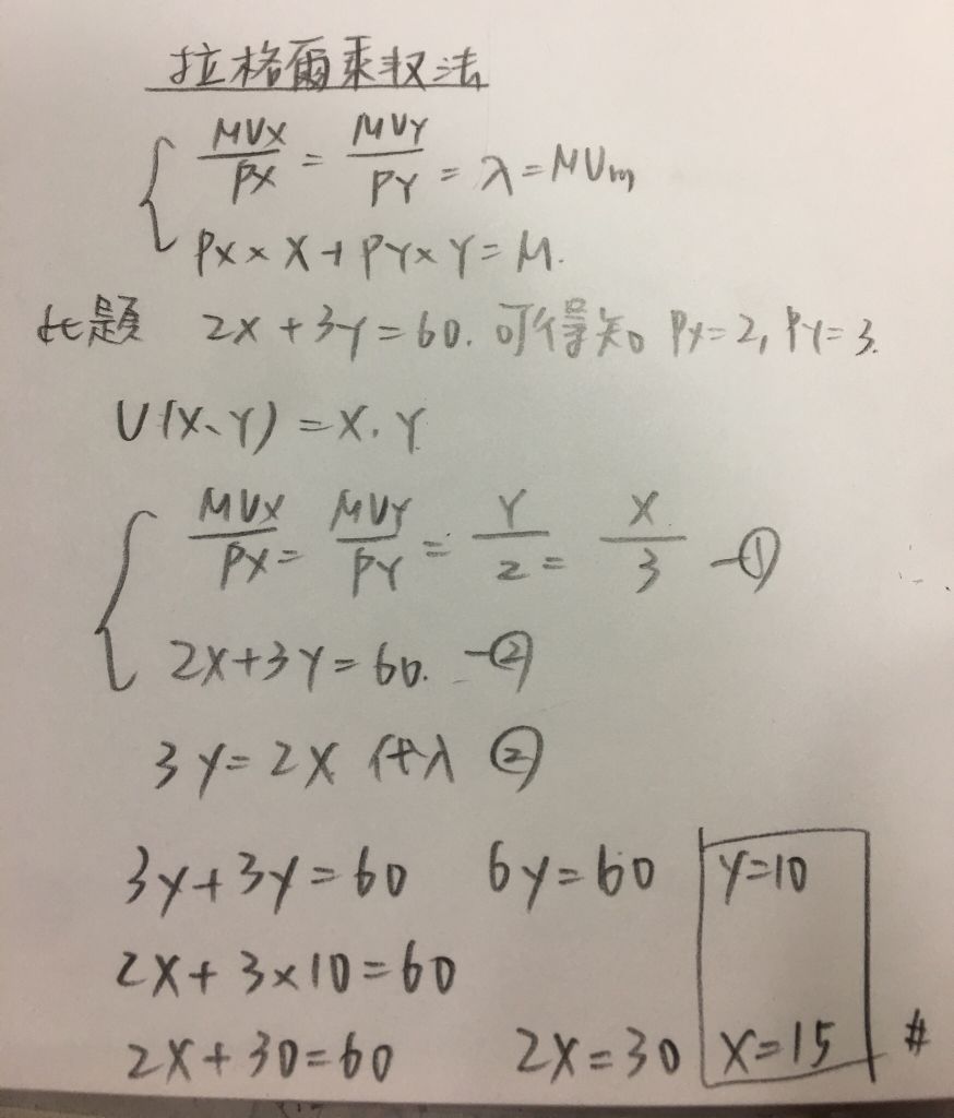 15. 假設一消費者之效用函數為U(x,y) = xy,預算限制式為 2x + 3y = 60,下列何者為此消費者效用極大化下之最 適財貨組合?