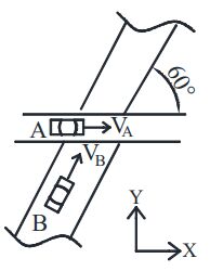15. 如右圖所示,A車以時速100公里行駛於高架道路上,B車則以時速60公里行駛於下方之平面道路上,兩條道路平面投影之交角為60度。請問A車相對於B車的速度值為何?