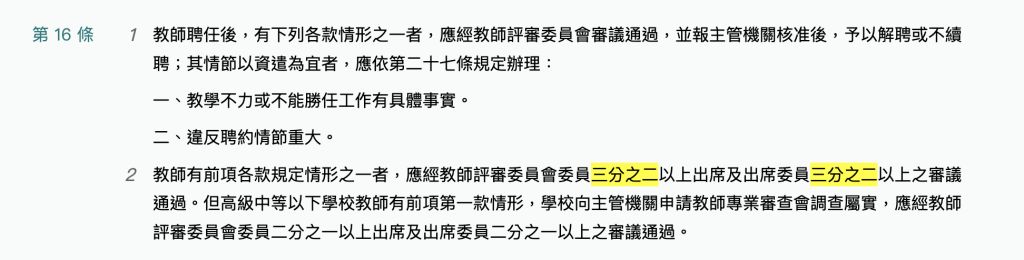 教師有前項各款規定情形之一者,應經教師評審委員會委員三分之二以上出席及出席委員三分之二以上之審議通過。但高級中等以下學校教師有前項第一款情形,學校向主管機關申請教師專業審查會調查屬實,應經教師評審委員會委員二分之一以上出席及出席委員二分之一以上之審議通過。