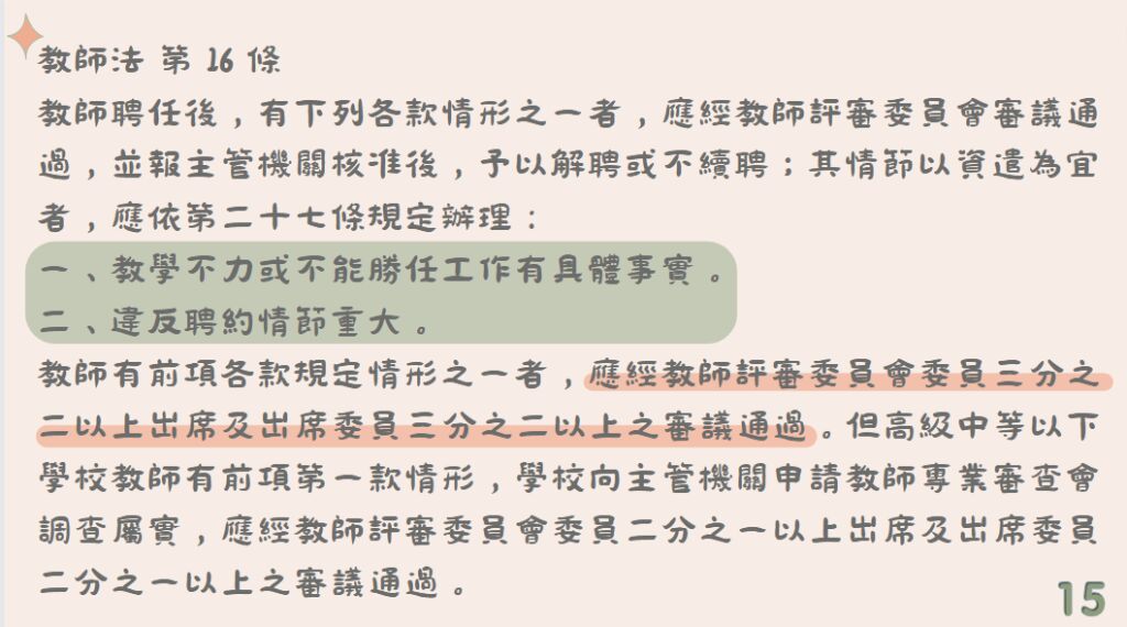 15. 教師聘任後,因教學不力或不能勝任工作有具體事實者,應經教師評審委員會審議通過,