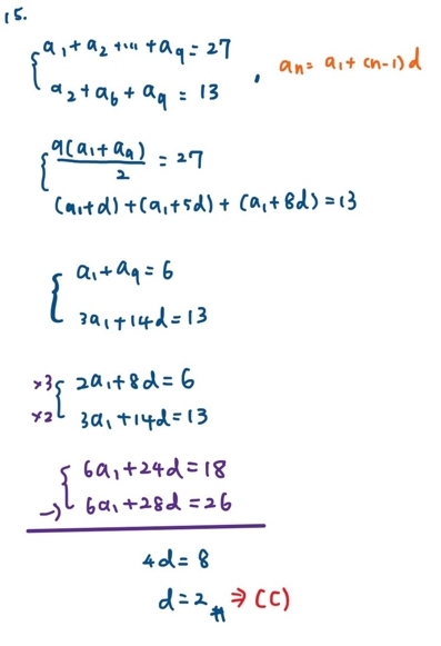 15. 有一等差數列,前9項的和為27,且第2項、第6項、第9項的和為13。求此等差數列的公差。