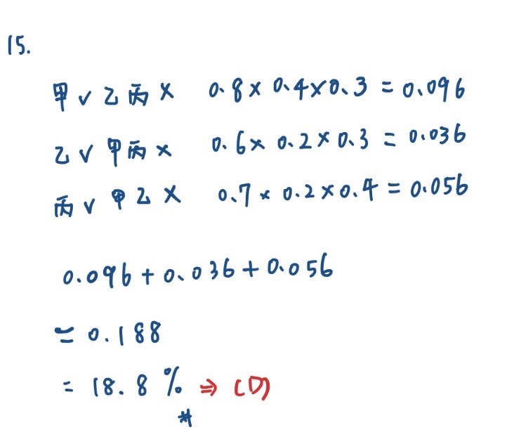 15. 甲乙丙三人打靶,假設甲的命中率為80%,乙的命中率為60%,丙的命中率為70%,現在三