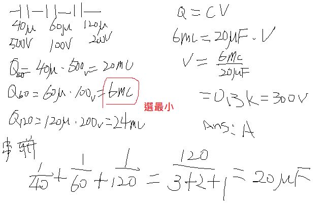 15. A 電容器為 40 微法拉,耐壓 500 伏特;B 電容器為 60 微法拉,耐壓 100 伏特;C 電容器為
