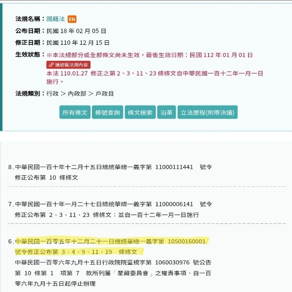多年的中華民國身分證,顯示我國對於此類具有特殊功勳移民的認同,此項政策鬆綁的法源是 105 年 12 月那一