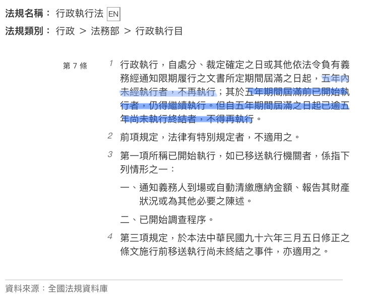 行政執行,自處分、裁定確定之日或其他依法令負有義務經通知限期履行之文書所定期間屆滿之日起,五年內未經執行者,不再執行;其於五年期間屆滿前已開始執行者,仍得繼續執行。但自五年期間屆滿之日起已逾五年尚未執行終結者,不得再執行。