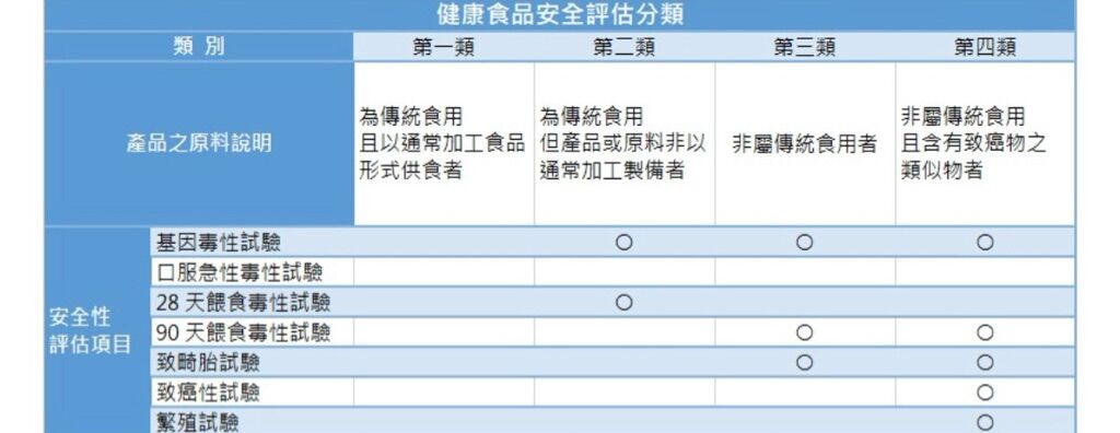 健康食品之安全評估分為四個類別,主要係針對以往長期食用及製造加工之安全性作考量,故食用目的、方式、製造加工方法、流程、最終產品形式及攝食量等均為分類之考慮因素。各類之安全評估項目如下: