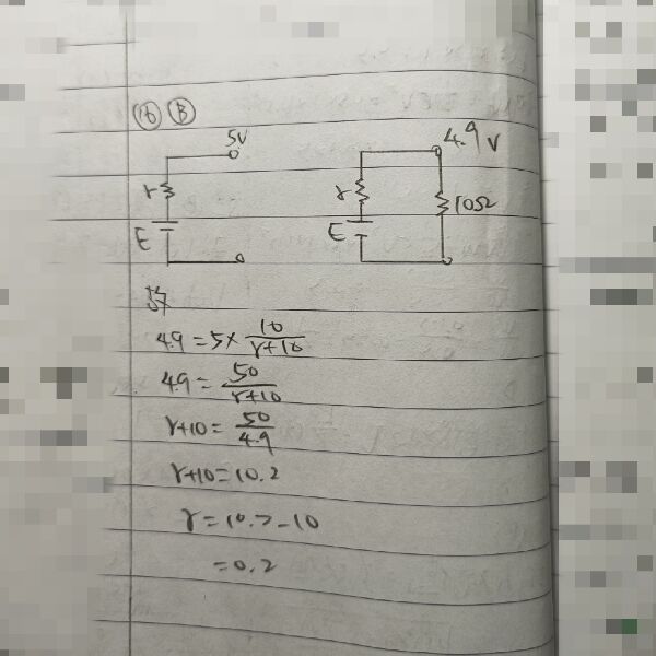 16 一個電壓源,在開路未接負載時,量得電壓為 5 V。接上 10 Ω 之負載,量得電壓為 4.9 V。問電壓源