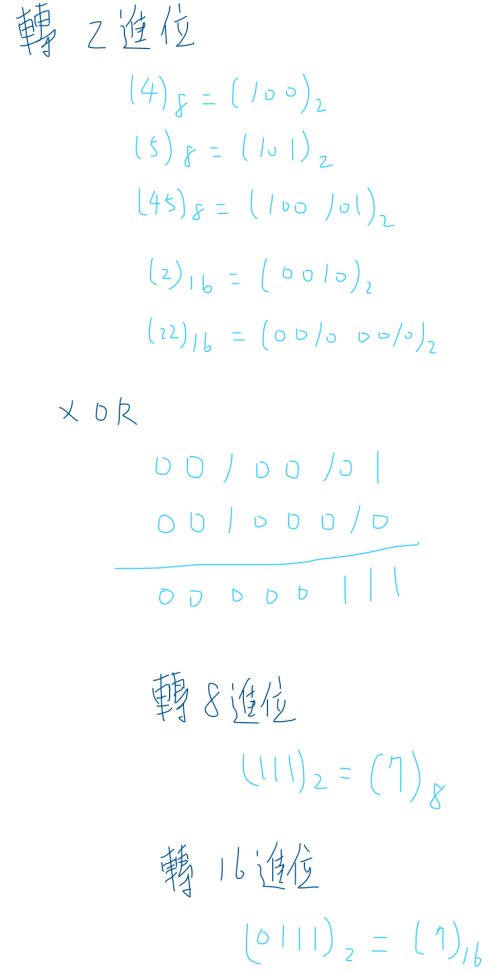 16 已知變數 X=(45)8,為八進位數,Y=(22)16,為十六進位數,若將 X 與 Y 做邏輯的 XOR 運算之後產生 Z,求 Z=?