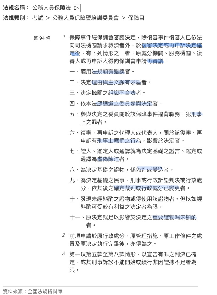 保障事件經保訓會審議決定,除復審事件復審人已依法向司法機關請求救濟者外,於復審決定或再申訴決定確定後,有下列情形之一者,原處分機關、服務機關、復審人或再申訴人得向保訓會申請再審議: