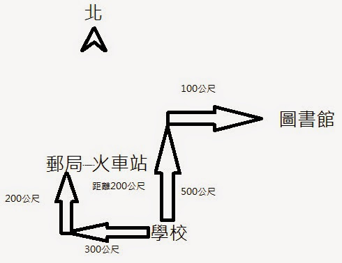 甲:從學校向北直走500公尺,再向東直走100公尺的可到圖書館。
