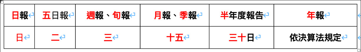 四、月報、季報於期間經過後十五日內送出。但法令另定期限者,依其期限。
