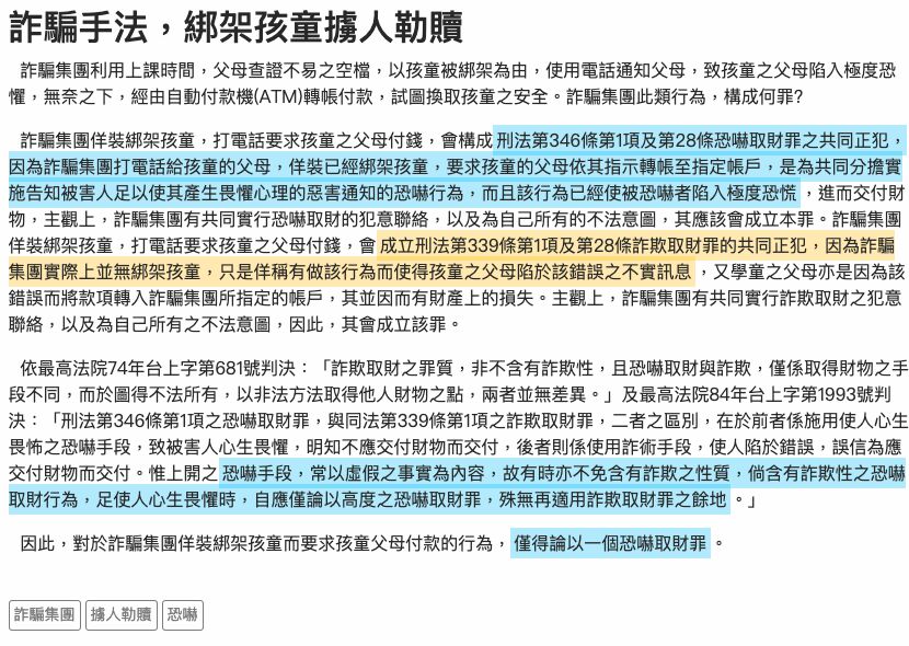 最高法院84年台上字第1993號判決:「刑法第346條第1項之恐嚇取財罪,與同法第339條第1項之詐欺取財罪,二者之區別,在於前者係施用使人心生畏怖之恐嚇手段,致被害人心生畏懼,明知不應交付財物而交付,後者則係使用詐術手段,使人陷於錯誤,誤信為應交付財物而交付。惟上開之恐嚇手段,常以虛假之事實為內容,故有時亦不免含有詐欺之性質,倘含有詐欺性之恐嚇取財行為,足使人心生畏懼時,自應僅論以高度之恐嚇取財罪,殊無再適用詐欺取財罪之餘地。」