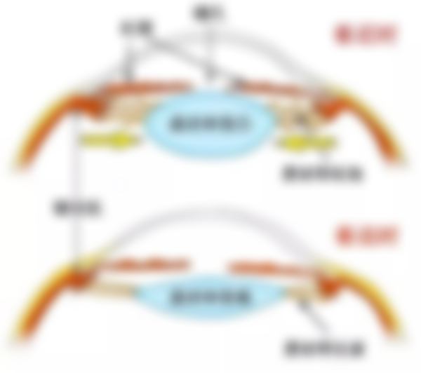 遠:睫狀肌纖維放鬆,懸韌帶收縮(拉緊),水晶體變得較扁平