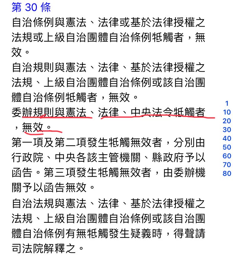 委辦規則與憲法、法律、中央法令牴觸者,無效。(由委辦機關予以函告無效。)
