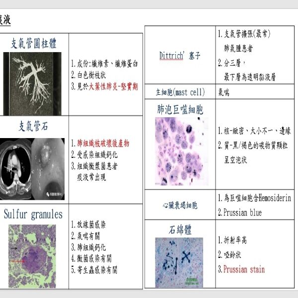 石綿體:啞鈴外觀,為石棉纖維被肺泡巨噬細胞吞噬後再包覆ferritin和蛋白質的complex,故可以被Prussian blue stain(+)。