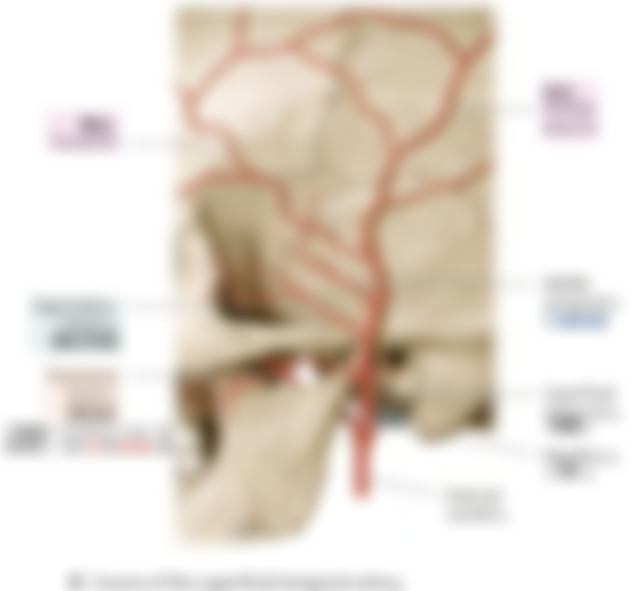 (A)淺顳動脈在離開腮腺(parotid gland)前,在下顎頸部(mandibular neck)高度會釋出顏面橫動脈 (transverse facial artery)行走於咬肌和腮腺體之間