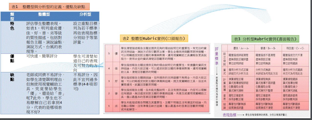 建立評分的評量規準,以質性描述列表,結合量化分數,評估學生特定作業或表現,