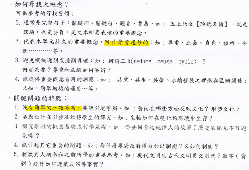 1. 先確定目標及評量,再設計教導與學習活動,特別強調能力為導向的課程設計,以強化核心素養。而核心素養的學習目標有三種,包含:(一)大概念的掌握和正向價值觀的建構,(二)關鍵的知識和技能的習得,以及(三)與主題相關值得學習的內容之理解(Wiggins & McTighe,2006)。