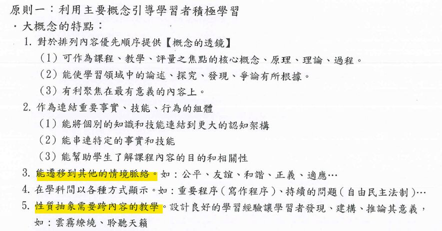 大概念的掌握和正向價值觀的建構>>概念和價值觀應該屬於"抽象",正向價值觀應該屬於"普遍可類化",非特定情境下