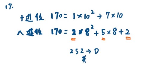 17. 十進位數值170若改以八進位表示時,其表示值為何?