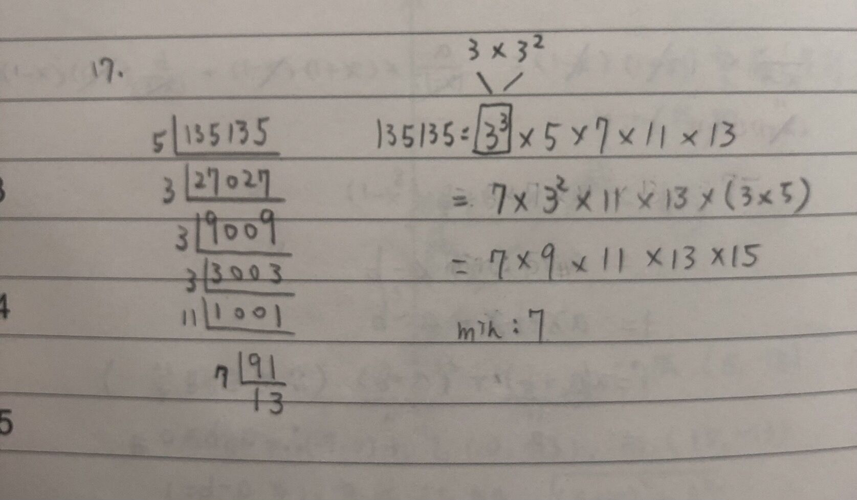 17. 有五個連續奇數的乘積為 135135,則此五個連續奇數中,最小的數為何?