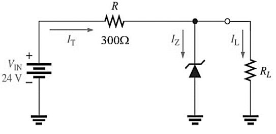 18 假設理想稽納二極體(Zener Diode)參數如下:VZ = 18 V、IZK = 1 mA、IZM = 45 mA,rZ = 0 Ω,如圖中的稽納二極體仍然可以穩壓工作的前提下,負載的最大電流值為何? (A) 20 mA (B) 19 mA (C) 5 mA (D) 0 mA