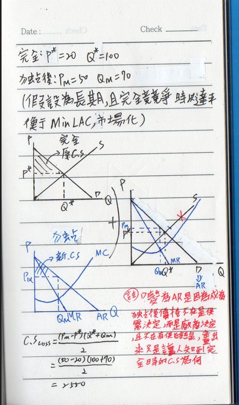 市場為完全競爭時,市場價格為 20,數量為 100,成為獨占市場後,價格提高為 50 而數量減少為 70。因為市場