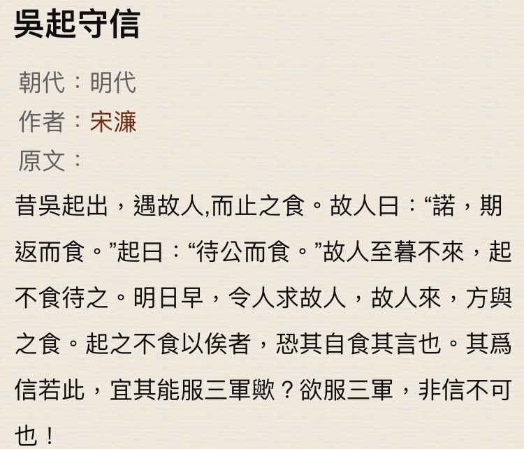從前吳起外出遇到了老友,就留他吃飯。老友說:“好啊,那你等我。”吳起說:“( 我在家裡)等待您一起吃飯。”老友到了傍晚還沒有來,吳起不吃飯而等候他。第二天早晨,(吳起)讓人去找老友,老友來了,才同他一起吃飯。吳起不吃飯而等候老友的原因是,怕自己說了話不算數啊。他堅守信用到如此程度,這是能使軍隊信服的緣由吧!要使軍隊信服,(作為將領)不守信用是不行的