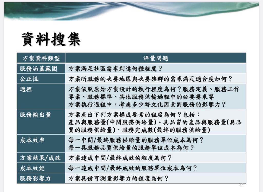 - 過程資料:方案依照原始服務設計的執行程度為何?可依下列層面探究:服務的定義、服務的工作項目、服務的標準、其他服務供輸過程中的必要要求等等。在方案執行過程中,考量多少跨文化因素對服務的影響力?