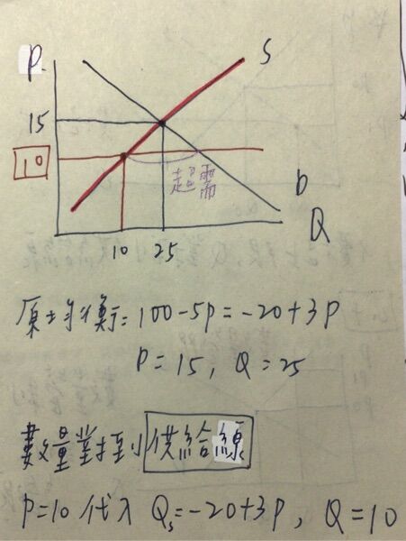 18 某產品市場的需求函數為 Q = 100 − 5P,供給函數為 Q = -20 + 3P,如果政府管制市場價格不得超過 10,
