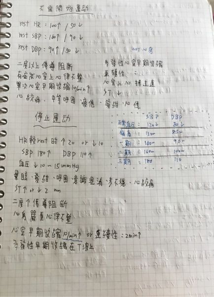 SBP不超出220-240。運動時,收縮壓本身就不能往下掉,往下掉表示心室功能不良(不能耐受運動)