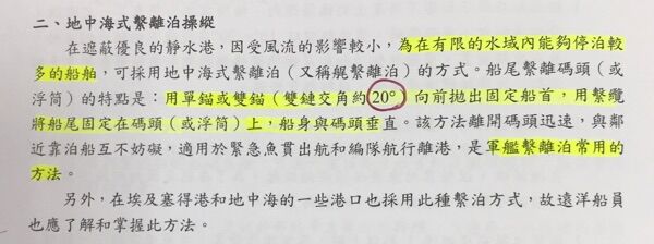 18. 操作地中海式繫泊,有風時會拋八字錨,兩錨之交角通常為多少度?