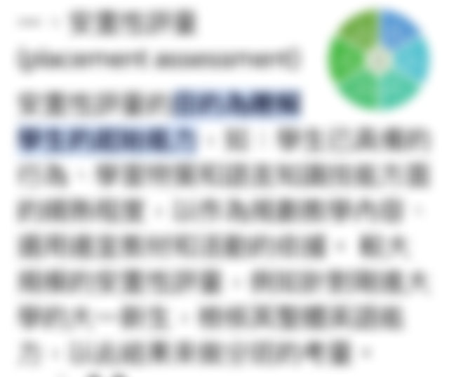 @安置性評量:在教學之前為了解學生對學習新知識應具備之基本條件的評量,作為初步瞭解班上學生程度,以便做為分組之用。