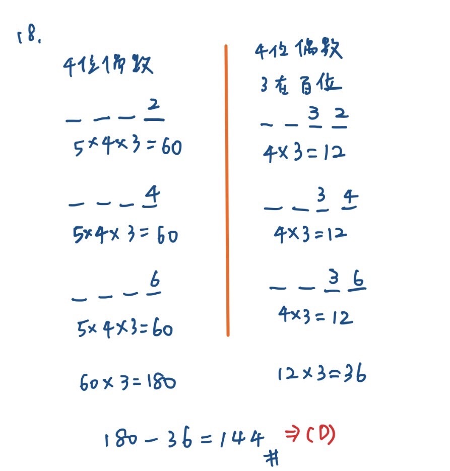 18. 用2, 3, 4, 5, 6, 7這六個數,可以組成多少個不重複的4位偶數,但3不在百位上?