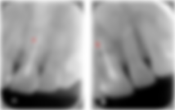 下方是針對上顎前牙區進行不同角度拍攝的放射線檢查影像,下列對於左上正中門齒的敘述何者較正確?