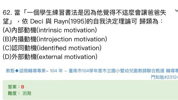 19.「小強學習數學是為了避免處罰、獲得獎賞」,依據自我決定動機理論,