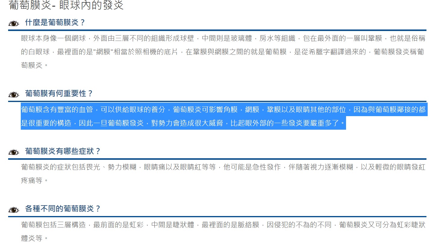 葡萄膜含有豐富的血管,可以供給眼球的養分,葡萄膜炎可影響角膜,網膜,鞏膜以及眼睛其他的部位,因為與葡萄膜鄰接的都是很重要的構造,因此一旦葡萄膜發炎,對勢力會造成很大威脅,比起眼外部的一些發炎要嚴重多了。 |