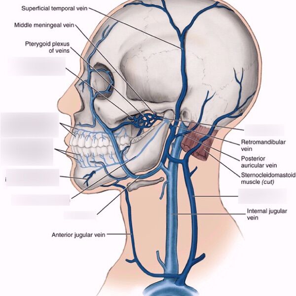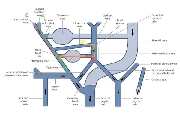 B. 可能是因為 是mental vein -> maxillary vein -> pterygoid plexus of vein (下圖)