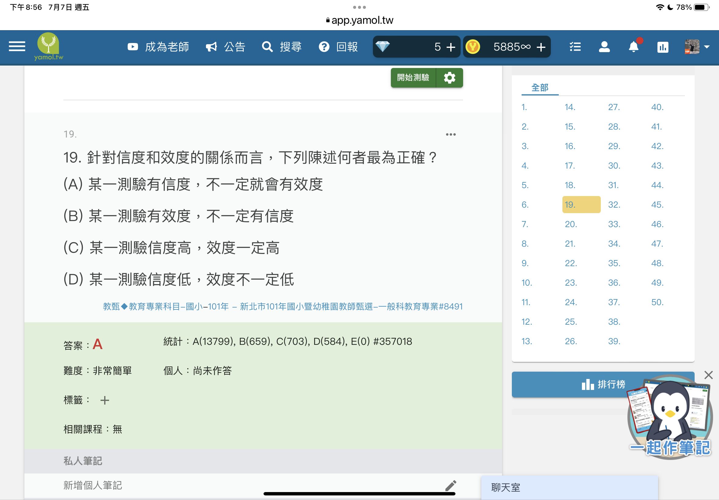 19.余老師自編一份 80 題的國語文成就測驗,其信度係數為 0.85。若依據原命題雙向細目