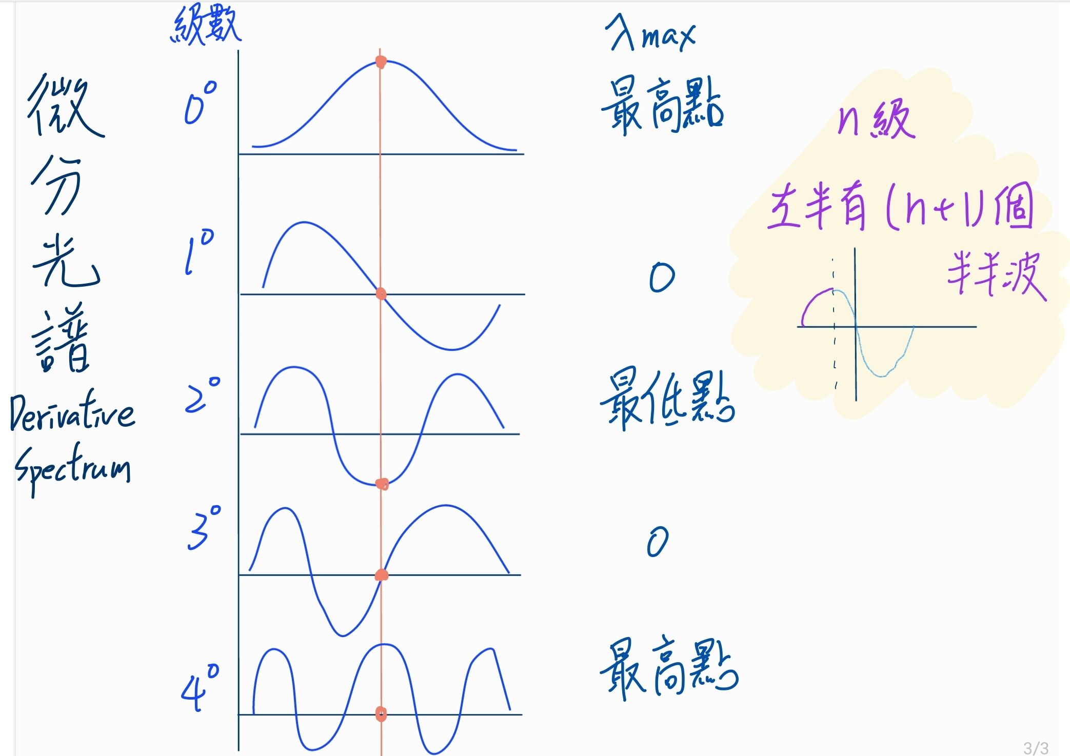 (C)一次微分曲線的零點對應於原光譜的最高點